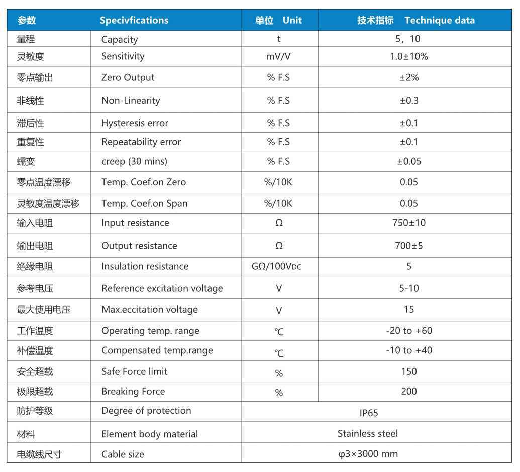 输出:1mv/V、0~±5/10V、4~20mA可选